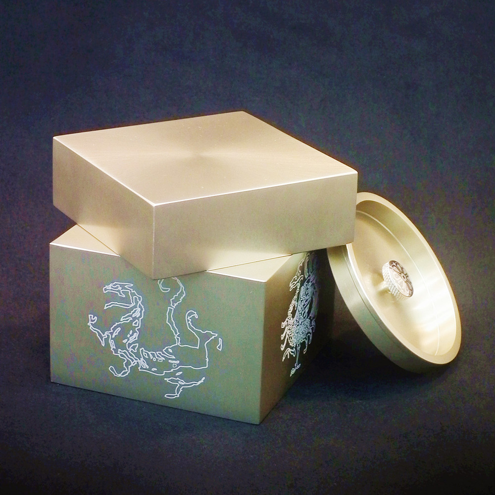 【時尚四象茶罐】 予人現代感之鈦金的時尚風,結合手工拉絲形成太陽花,光澤四射中優雅內斂, 隱約地浮現中國傳統四神獸圖騰。