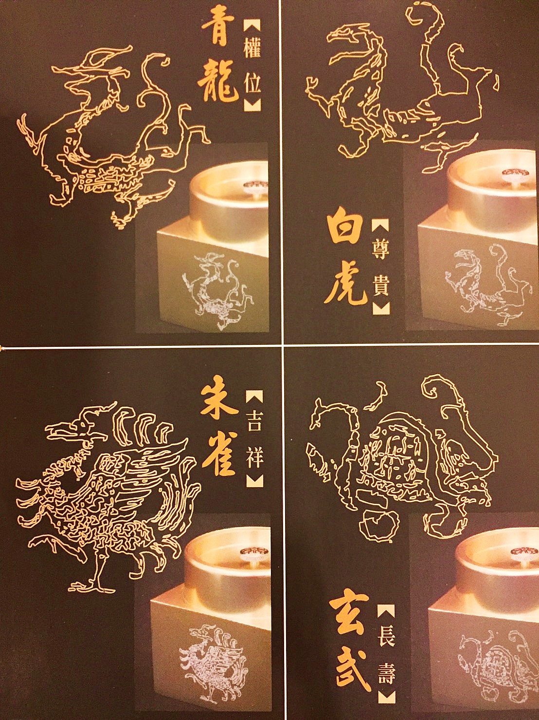 《禮記 典禮上》:『行前朱鳥而後玄武,左青龍而右白虎。』這四象之位,就是風水,前後左右都是彼此平衡和諧,柔順而有生旺的氣氛,才有好地理。青龍、白虎、朱雀、玄武又為鎮守天宮的四神,辟邪惡、調陰陽,使用四象茶罐,祈祝茶人於和諧精緻的生活中,得到平安吉祥。