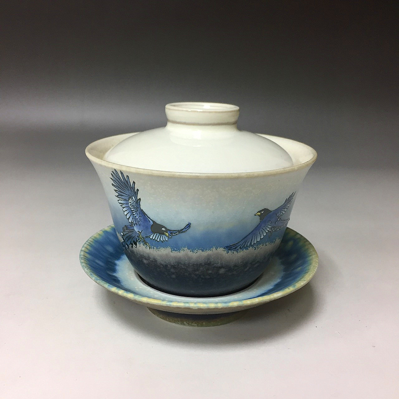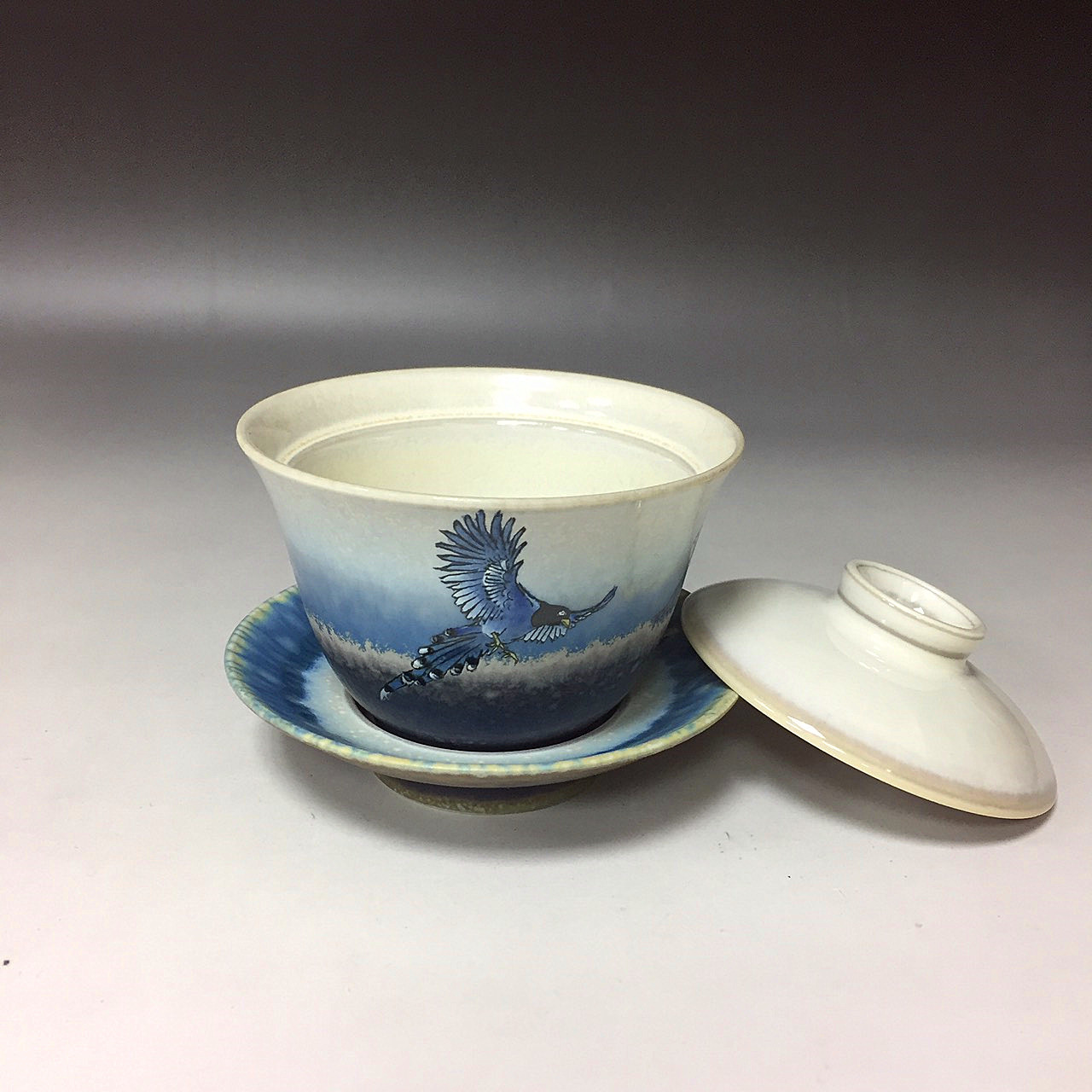 台灣藍鵲(學名:Urocissa caerulea),又叫台灣暗藍鵲、長尾山娘(POJ:Tng-boe Soan-niu),為台灣特有種。連雅堂撰台灣通史於卷二十八虞衡志作練雀,記遊云:「俗稱長尾山娘,翠翼朱喙,光彩照人。」全球僅台灣島內山地有本物種分布。分布於低海拔的闊葉林,台灣藍鵲的羽色特別深濃。 藍鵲蓋碗製作工藝是於坯體成形後,先經800c素燒後,噴上一層底釉,在外層再掛一次釉,第二次入窯高溫燒成。應用二釉色在高溫時熔融、相疊處產生無可預期的變化,此為雙掛釉技法。 藍色雙掛釉交織成景,猶如大自然的變化無窮無盡,時如雲彩奔騰於廣闊無際的天邊,時如浪花激起海天一色。每個作品都是一幅天然的美景,獨一無二、氣韻無窮。壺身上再以手工彩繪臺灣保育珍禽一藍鵲,優雅地展翅飛向天際,為美麗的大地,寫出動人的詩篇。