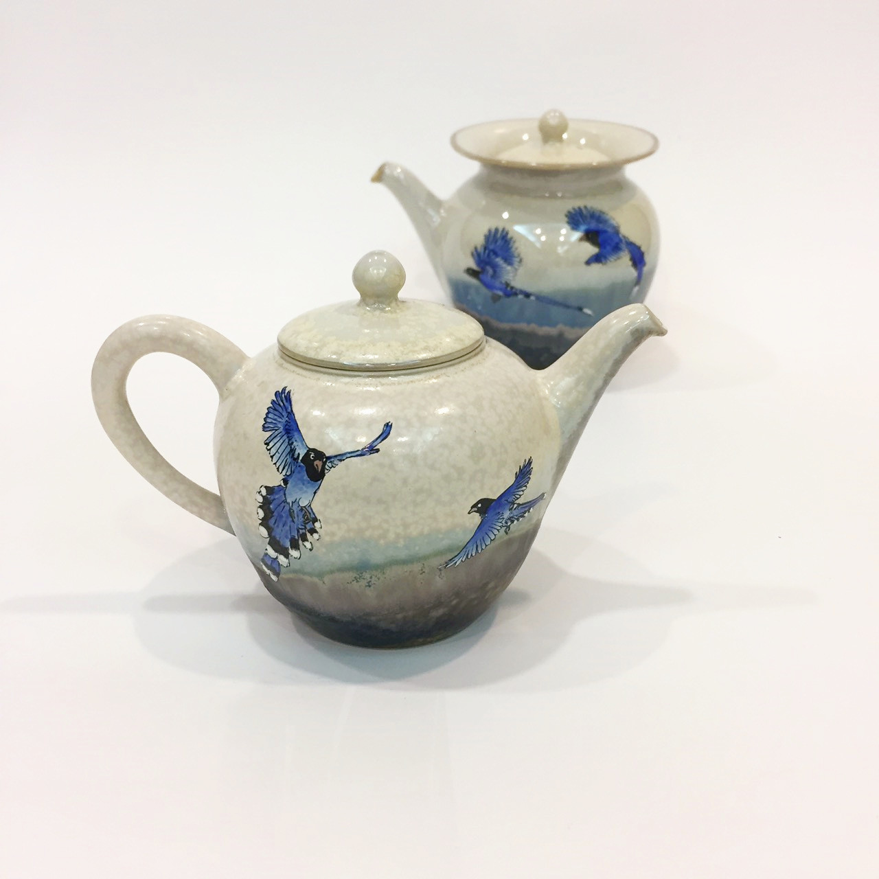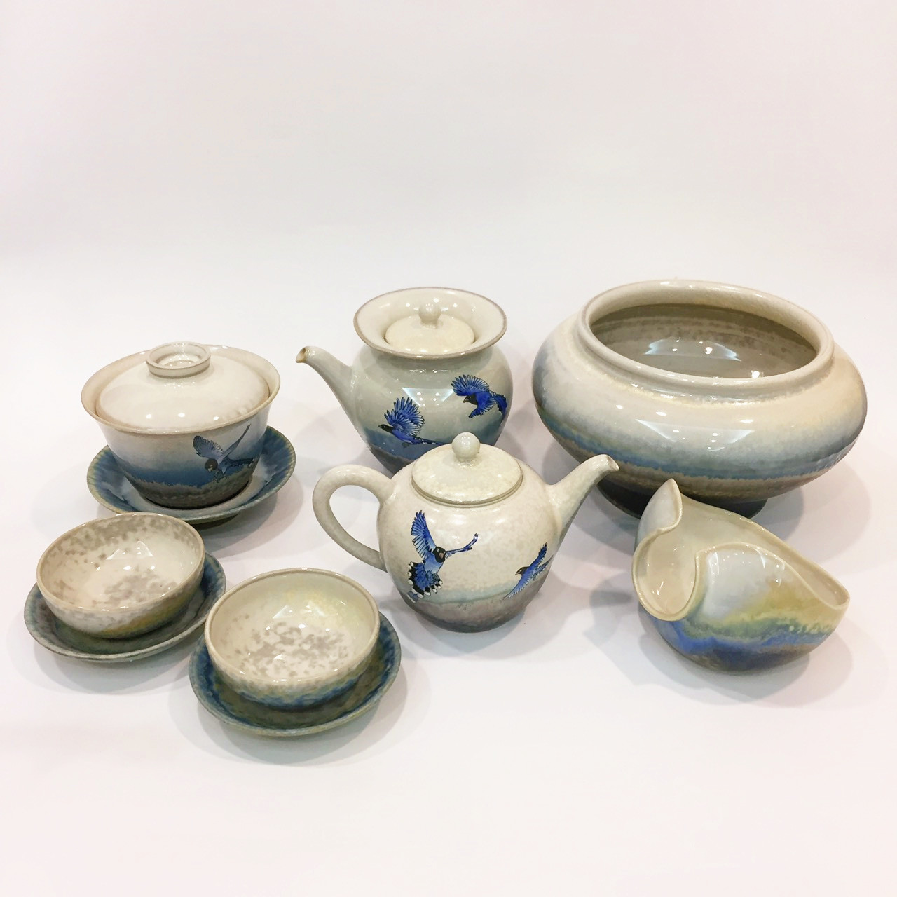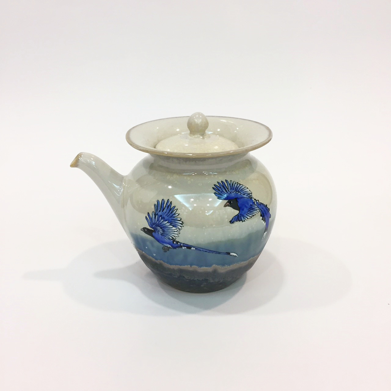 藍鵲壺組製作工藝是於坯體成形後,先經800c素燒後,噴上一層底釉,在外層再掛一次釉,第二次入窯高溫燒成。應用二釉色在高溫時熔融、相疊處產生無可預期的變化,此為雙掛釉技法。 藍色雙掛釉交織成景,猶如大自然的變化無窮無盡,時如雲彩奔騰於廣闊無際的天邊,時如浪花激起海天一色。每個作品都是一幅天然的美景,獨一無二、氣韻無窮。壺身上再以手工彩繪臺灣保育珍禽一藍鵲,優雅地展翅飛向天際,為美麗的大地,寫出動人的詩篇。 The production process of Blue Magpie Painted Teapot Set is that after the porcelain is shaped, uses 800'C biscuit firing, and sprays on a bottom layer of glaze, then sprays again on the outer layer. After that, puts it in the kiln and firing with high-temperature the second time. Application on two glazes melt at high temperatures, unpredictable changes at where overlaps, is the double-hung glaze techniques. Blue double-hung glaze techniques interweaves into the scene, like the nature changes endlessly. Sometimes like clouds galloping in vast sky, sometimes like spindrifts arouse the sky and sea. Every pieces is a natural beauty, unique and artistically infinite. On the pot body, with hand-painted Taiwan Blue Magpie, a protected species of rare birds, gracefully soaring to the sky, writes moving poems for beautiful earth.